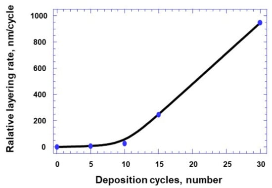 In addition, it was found that the sedimentation rate in the first 10 cycles is much lower than in the subsequent ones. The formation of local bottom and surface deposition centers occurs with an increase in the number of deposition cycles from 5 to 10 (Figure 6). In addition, it was found that the formation of a continuous layer on the surface of the NAA matrix occurs with a predominance of the surface deposition mechanism along the horizontal plane with an increase in the number of deposition cycles from 10 to 15. Surface deposition on top of the matrix and insignificant near-wall deposition on vertical walls and bottom deposition is probably associated with a change in the mechanism of layer formation from the ionic to ionic-colloidal deposition mechanism [23]. This assumption makes it possible to explain the significant thickness of the deposited layer on the matrix surface (more than 1 μm) when the number of deposition cycles is more than 15. The dependence of deposited HTO layer thickness on the number of deposition cycles has two linear sections, the first one is gentle up to the 10th cycle, and the second one is steep from 10 to 30 cycles (Figure 6). These data differ from the results presented in the literature by different authors for the SILAR method [16,23], whereby the dependence of the growth of the deposited layer thickness on the number of cycles is linear.