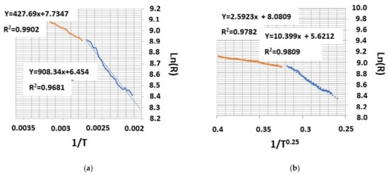 Temperature dependence of electrical resistance for nanostructured TTO on NAA as: (a) lnR = f(1/T); (b) lnR = f(1/T0.25).