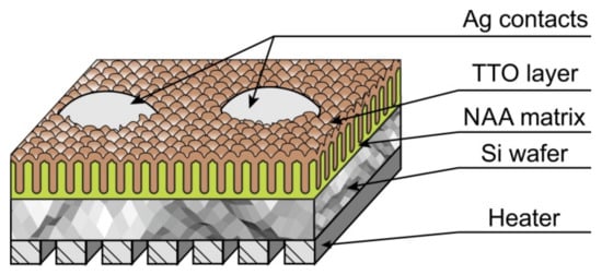 To study the gas-sensitive properties of nanostructured TTO films, test structures were fabricated, which are silicon substrate with NAA on which compound of SnxWyOz were deposited by the 15 cycles SILAR method. To give the film a crystalline structure, it was annealed in vacuum at temperature of 823 K for 40 min. On the backside, there was a platinum heater providing a stable temperature regime during measurements. Contacts were formed on the surface of the film under study to register the change in resistance as result of chemisorption of the analyzed gas molecules with the film surface. The schematic representation of the test sensory structure is shown in Figure 8.