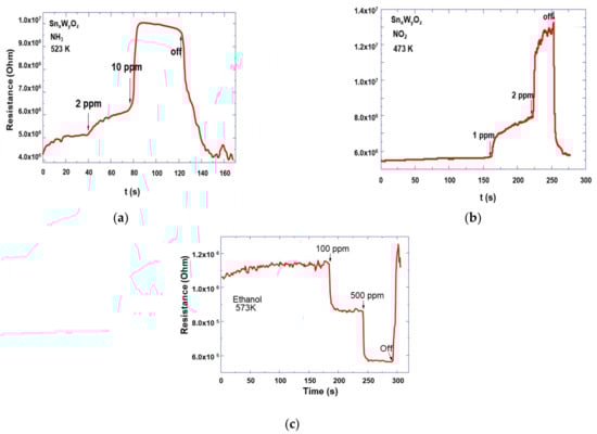 The tin-tungsten oxide nanocomposites have also been shown to be highly sensitive to nitrogen dioxide. At the same time, the operating temperatures for this gas lay in a wider range from 420 to 525 K, and the sensitivity increased slightly with increasing temperature. Therefore, we chose a lower heating level of the test structure in order to ensure the minimum power consumption at an acceptable sensitivity at NO2 extremely low concentrations. Figure 9b shows responses to nitrogen dioxide at 473 K. The test structure sensitivity with TTO nanostructured active layer at nitrogen dioxide concentrations of 1 and 2 ppm were 0.48 and 1.4, respectively, at temperature of 473 K (Figure 9b).