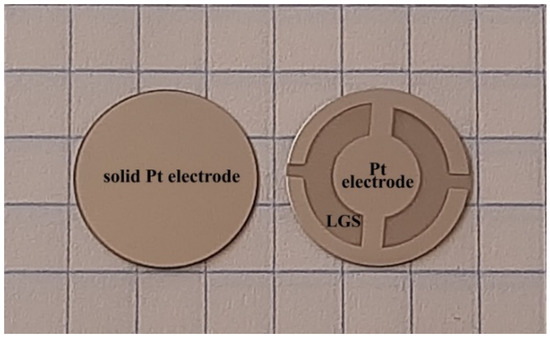 Figure 1 shows a photograph from both sides of an LCM that was used as a resonator to create a UV sensor. For the fabrication of the resonator, the °-cut of an LGS crystal was used, which is associated with the subsequent formation of a ZnO film or an array of ZnO nanorods on the resonator surface. The use of piezoelectric quartz SiO2 as a QCM is not possible, since during the formation of ZnO films or nanorods, it is necessary to use a high temperature of ~600 °C (annealing of the ZnO film, CVD synthesis of nanorods), which exceeds the phase transition temperature in quartz. The transition of α-quartz to β-quartz occurs at a temperature of 573 °C. This process is irreversible, so using quarts to fabricate UV sensors, in this case, is difficult. Using crystals of the langasite family is optimum to fabricate resonators (microbalances). The phase transition temperature in these crystals is ~1450 °C. A number of crystal cuts, including °-cut, have almost a zero temperature coefficient of frequency. The standard resonator diameter is 14 mm.
