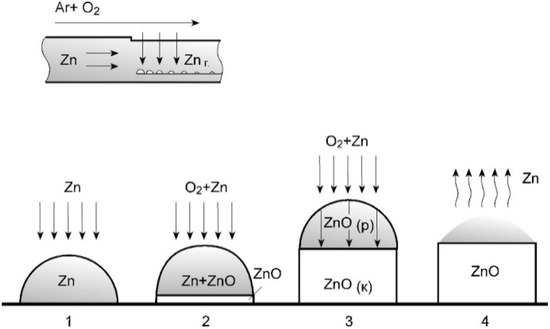VLS growth of ZnO nanorods: 1—formation of zinc droplets (beginning of the process), 2—nucleation of the ZnO crystal, 3—growth of the ZnO nanorod, 4—evaporation of the zinc drop (end of the process).
