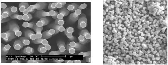 - Redkin, A.N.; Ryzhova, M.V.; Yakimov, E.E.; Gruzintsev, A.N. Aligned Arrays of Zinc Oxide Nanorods on Silicon Substrates. Semiconductors 2013, 47, 252–258. [Google Scholar] [CrossRef]