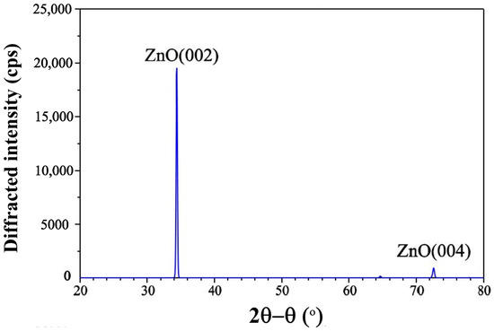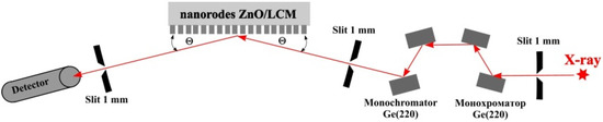 To study the structure of ZnO nanorods, the high-resolution X-ray diffraction spectrum of ZnO nanorods was measured on a four-circle Bruker D8 Discover diffractometer with a rotating copper anode (Cu radiation, Å) in a doble–crystal X-ray diffractometer scheme. Figure 4 schematically shows a double-crystal X-ray diffractometer, used to measure the diffraction spectra of ZnO nanorods. X-ray radiation was collimated with an entrance slit of 1 mm. Then, X-ray radiation was monochromatized using two double Ge(220) monochromators in the Barter scheme. After the monochromators, X-ray radiation was re-collimated with a 1 mm slit. Then, X-ray radiation falls on the surface of the Pt electrode of LCM covered by ZnO nanorods at an incidence angle . The diffracted X-ray radiation was recorded with a standard NaI scintillation detector with a 1 mm entrance slit. The diffraction spectrum was measured in an angular scanning scheme , where the detector is rotated by an angle of when the sample is rotated by an angle of .