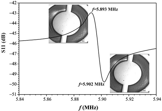 Amplitude-frequency response (S11) of the ZnO nanorods/LCM (resonance–antiresonance).