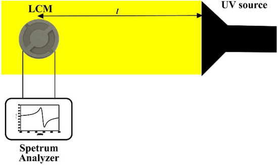 Figure 7 shows a scheme to investigate the properties of a UV radiation sensor based on a ZnO nanorods/LCM system. The principle of the sensor is based on the fact that the equivalent circuit of the LCM resonator is an L–C–R electrical circuit (L is inductance, C is capacitance, R is resistance). The presence of nanorods on the surface of the Pt electrode can be seen as an additional capacitor embedded in parallel to the capacitor of the LCM resonator. In this case, when two capacitors are connected in parallel, their capacitances are added up. The formation of additional charges under the influence of UV radiation leads to an increase in the capacitance of a capacitor based on ZnO nanorods. As shown in Figure 7, ZnO nanorods on the surface of the Pt electrode were irradiated with a UV lamp with a wavelength of 240 ÷ 360 nm and a power density of 300 mW/cm2. The distance from the UV lamp to the LCM varied from 15 to 30 cm. With increasing , the irradiation intensity decreases and, respectively, the amount of charges formed in the ZnO nanorods decreases and the capacitance of the capacitor decreases. The amplitude-frequency response of the ZnO nanorods/LCM was recorded using a spectrum analyzer.