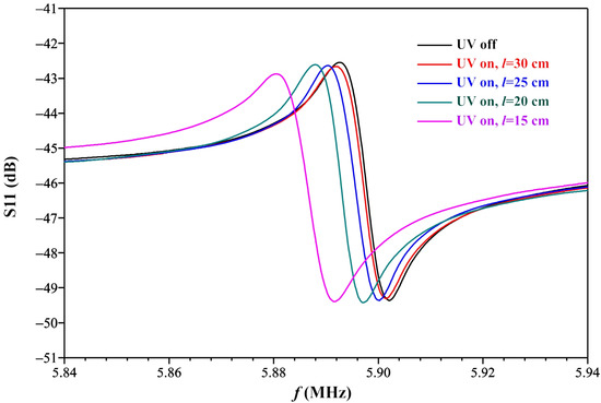 Variation of S11 characteristics of ZnO nanorods/LCM sensor under the influence of UV radiation versus distance from the UV radiation source to the UV sensor.