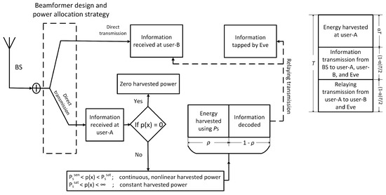In the first time slot, information is transmitted from BS to user-A, user-B, and Eve. The message signals and of user-B and user-A, respectively, are superposed as and then broadcast towards all the users through N number of transmit antennas of BS, where and are the power allocations coefficients. Furthermore, following the principle of NOMA, it is assumed that + = 1, and . The information received during first time slot is divided as follows.