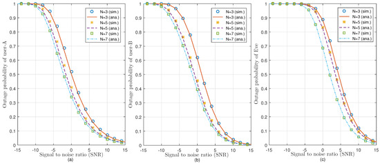 Figure 3a–c presents the OP of user-A, user-B, and Eve as a function of SNR, respectively, for validation purposes. The results derived from closed-form OP expressions are well matched with the simulation results, which indicates the validation of our model. It can also be observed that user-A shows better outage probability among others, while the outage probability of undesired user, i.e., Eve has the worst outage probability. This is because the distance between BS and Eve is assumed as . Furthermore, the impact of antenna diversity can also be seen in Figure 3. By increasing the number of antennas at the transmitter side, it results in better outage probability. Similarly, it can also be observed that the outage probability of the users gets improved at higher values of SNR.