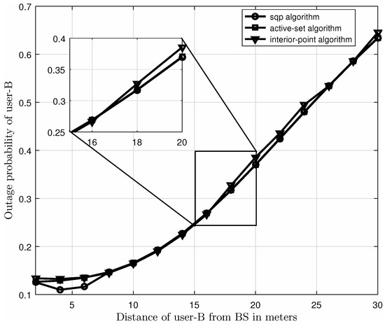 Now, in Figure 4 we explain the complexity of our model by computing the execution time of the algorithm. The execution times in seconds, of sequential quadratic programming (“sqp”), “active-set”, and “interior-point” algorithms are 1.250742 s, 0.278754 s, and 2.700135 s, respectively. Intel Core i7-7500U CPU @ 2.70 GHz 2.90 GHz is used with 8GB RAM. Furthermore, the outage probability comparison of these three algorithms is shown in Figure 4, where the “sqp” algorithm gives lower outage probability as compared to “active-set” and “interior-point” algorithms specially for smaller distance of user-B from BS. For the rest of the experiments, we have considered “sqp” as optimization algorithm due to its superior performance.