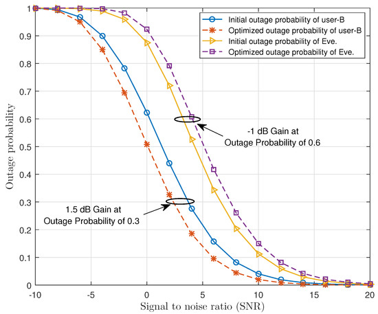 Figure 5 presents the comparison of outage probability before and after the optimization of user-B and Eve. The positive gain of 1.5 dB, achieved by the user-B after the optimization, can be observed in this figure. Note that without degrading the outage probability of user-A, we have improved the optimized outage probability of user-B by 12%. At the same time, degradation in the outage probability of Eve by 10% and the negative gain of 1 dB is also achieved. This is because we have adjusted the beam from BS to user-B by using beamformer vector in such a way that the beam becomes narrowed and is directed towards the legitimate user so that it becomes difficult for Eve to access the message signal of user-B. Similarly, Figure 5 can also be observed with respect to SNR, i.e., higher values of SNR result in better outage probability of the users.
