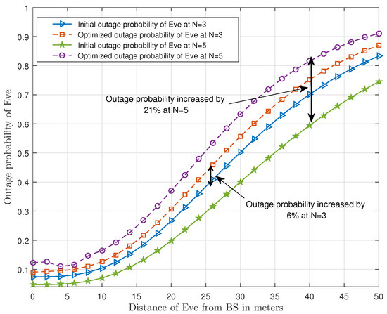 Next, the distance of Eve from the BS is studied more deeply in Figure 6. It can be observed that going away from the BS degrades the performance of Eve. The difference between the initial and optimized outage probability values of Eve can also be seen in Figure 6. It can be observed that the optimized outage probability of Eve is increased by 6% and 21% when the number of transmit antennas are and , respectively. Additionally, an important result, which we have depicted in Figure 6, is that we achieve the higher gain value by increasing the number of transmit antennas. A reason herein is that the Eve is far from the BS, thus the channel conditions between BS and Eve are poor.