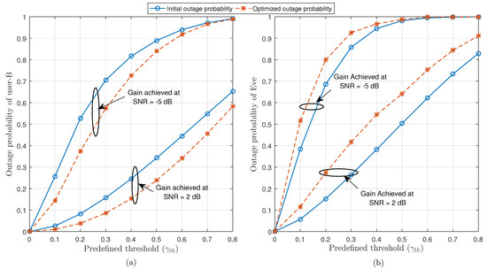 Figure 7 indicates the behaviour of outage probability of user-B and Eve under different values of predefined threshold . It is observed that the proposed optimal beamforming got significant gain at two different values of SNR in case of both user-B and Eve as shown in Figure 7a,b, respectively. Note that at different values of SNR, the optimized outage probability of user-B performs better as compared to its initial outage probability (before optimization). The optimized outage probability of Eve is degraded as compared to its initial outage probability by applying the proposed optimal beamforming algorithm, which ensures the accomplishment of our goal about secure communication for cell-edge user.