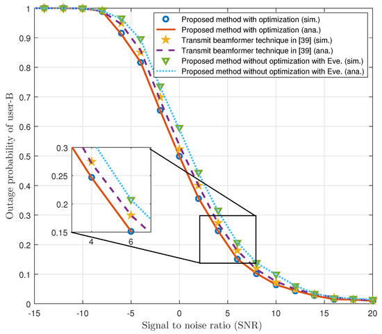 Last, Figure 8 presents a comparison of our proposed model with transmit beamformer-based technique [39] for the analysis of the outage probability of user-B in a similar network configuration. The main difference between the proposed work and the work in [39] is the general channel model. The physical layer security in MISO-NOMA system in the presence of an eavesdropper and secure communication criteria for the legitimate users is discussed in our work, which was not addressed in [39]. It is observed in Figure 8 that the proposed method with optimization performs better as compared to the work in [39]. However, without optimization, the proposed method shows higher outage probability of user-B as compared to the technique in [39]. This is due to the presence of Eve, and although Eve is also present in case of optimization in the proposed model, our optimization algorithm degrades the outage probability of Eve and improves the outage probability of user-B.