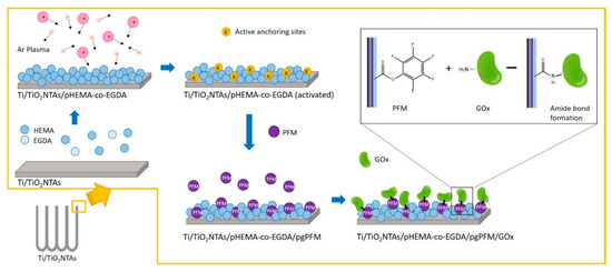 First, Ti/TiO2NTAs was obtained by anodic oxidation (applied voltage 30 V for 17 h). The anodization process is explained in more detail in reference [37]. Then, the PFM plasma grafted surface was performed using an initial film deposition of HEMA-co-EGDA. This process is described in more detail in a previous work [38]. Briefly, plasma modification techniques were applied to the Ti/TiO2NTAs electrode to obtain a polymerized film of HEMA-co-EGDA and a grafted deposition of PFM. All the plasma modification were carried out in a stainless-steel vertical plasma reactor (base pressure about 9 × 10−4 mbar). To obtain the ppHEMA-co-EGDA film, the reactor was fed with approximately twice as much monomer (HEMA, 3.6 × 10−2 mbar) as cross-linker (EGDA, 1.2 × 10−2 mbar), and plasma polymerization was performed (20 W, duty cycle 2/22) for 10 min. Then, the ppHEMA-co-EGDA film was activated by Ar plasma and PFM was grafted at 7.7 × 10−2 mbar for 15 min. Thus, Ti/TiO2NTAs/ppHEMA-co-EGDA/pgPFM electrodes were obtained. Finally, GOx was immobilized by placing 20 µL of a GOx solution (15 mg/500 µL) on the modified PFM/grafted film. Figure 1 shows a schematic representation of the covalent immobilization process applied to attach the glucose oxidase molecules to the TiO2NTAs.