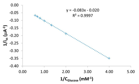where iss (µA) is the steady-state response current after the addition of the substrate, imax (µA) is the maximum current under saturated substrate conditions, and Cglucose (mM) is the bulk glucose concentration. Therefore, by plotting the inverse of the substrate concentration vs. the inverse of the corrected intensity, a straight line with slope KMapp/imax and with the intercept equal to 1/imax is obtained. A calibration curve obtained with the Ti/TiO2NTAs/ppHEMA-co-EGDA/pgPFM/GOx/Chitosan biosensor is used to obtain this information, and is presented in Figure 3.