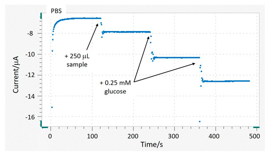 As shown in Figure 4, the registered current after the sample addition increased by approximately 1.3 µA, whereas after each standard injection (0.25 mM glucose) the current increment was about 2.2 µA. These current increments resulted from the reduction of H2O2 to H2O, which occurred due to the enzymatic reaction (see Reactions (1) and (2)). The additions curve was derived by plotting the corrected current vs. the added glucose concentration. The glucose content in the sample was quantified by extrapolation in this addition curve.