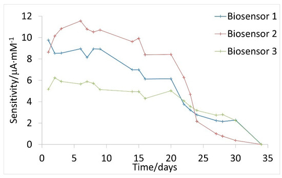 Figure 4 shows that sensitivity decreases over time. During the first 20 days following the construction of the biosensors, sensitivity showed slightly deviations for each biosensor. After 20 days, the developed biosensors conserved 89% of their initial sensitivity. However, after 20 days, the decrease in sensitivity became more pronounced. Finally, after 30 days the decrease in sensitivity was greater than 80% compared with the initial value in all cases.