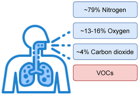 The air inhaled and exhaled by humans consists mainly of nitrogen, oxygen and carbon dioxide (Figure 1). Exhaled air contains more carbon dioxide and less oxygen than inhaled air because oxygen is used to generate energy during respiration, while carbon dioxide is produced as a by-product of the energy production process. Among the major components, exhaled breath consists of over 3500 Volatile Organic Compounds (VOCs) and a single breath consists of around 500 various VOCs, which are typically in the part per million (ppm), part per billion (ppb) or part per trillion (ppt) range [2]. Some of them are named biomarkers since their presence, as well as various concentration levels, may indicate several diseases. Biomarkers are compounds present in the body that can be used as indicators of physiology and diseases present. These types of VOCs are called endogenous VOCs and are produced by the metabolism of cells. On the other hand, the second type of VOCs are exogenous VOCs used to assess the effects of substances such as drugs, diet, cigarettes, toxic or noxious vapors and environmental pollution on the body. Exogenous VOCs are present in, for example, breath or blood as a result of circulation and/or internal metabolism [3,4,5]. Clear separation of biomarkers into these two groups is not possible because the same VOCs can be induced physiologically in the body as a result of disease, and also under the influence of external factors [4,5]. A general approach to determining biomarkers for a given pathological condition is to compare the VOC composition of a group of healthy and sick people [3]. There are several types of biomarkers: monitoring, predictive, prognostic, safety and susceptibility/risk biomarkers [6]. Systemic biomarkers are used to determine the functioning of the whole organism, while lung biomarkers are used to determine the processes and changes taking place in the respiratory system [7]. Currently, research is focused on biomarkers of various diseases, for example asthma [8,9], various types of cancers [10,11,12,13], chronic obstructive pulmonary disease [14,15] and, recently, metabolic disorders, such as diabetes [7,16,17,18,19,20,21,22,23,24], which will allow non-invasive detection and monitoring of these diseases using exhaled air. However, diet and pathological changes may affect the exhaled breath compositions; therefore, every person has their own unique molecular breath signature [7,25]. Similarly to a fingerprint, the exhaled profile is called the “breath-fingerprint” or “personal breath profile”. Common biomarkers of several diseases are listed in Table 1.