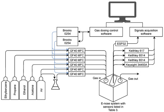 Selected gas sensors (listed in Table 3) were placed in a measurement chamber with a 180 mL capacity and supplied with appropriate voltages in accordance with their data sheets. Due to the relative humidity influence on sensors’ sensitivity, in addition to gas sensors, temperature, relative humidity and pressure sensors were also used. The BME280 (Bosch Sensortec, Reutlingen, Germany) and SHT85 (Sensirion, Staefa ZH, Switzerland) sensors were placed inside the measurement chamber, while the second SHT85 sensor was placed before the gases entered the measurement chamber. All used sensors, except SGP30 and SHT85, responded to the dosed gases as voltage. For SGP30, the sensor returned Total Volatile Organic Compounds (TVOCs) and an equivalent carbon dioxide reading (eCO2) over the I2C communication bus. TGS1820 (Figaro Engineering Inc, Mino, Osaka, Japan), TGS2620 (Figaro Engineering Inc, Mino, Osaka, Japan), TGS8100 (Figaro Engineering Inc, Mino, Osaka, Japan), MQ3 (Waveshare, Shenzhen, China) and MICS5524 (Amphenol SGX Sensortech, Corcelles-Cormondreche, Switzerland) sensors’ responses were measured using Keithley 617 (Tektronix, Beaverton, OR, USA), Keithley 6514 (Tektronix, Beaverton, United States) and multimeter Keysight 34450A electrometers (Keysight, Santa Rosa, CA, USA). If the sensor sent the measured values using the Serial Peripheral Interface (SPI) or Inter-Integrated Circuit (I2C) communication bus, the ESP32 dev board (Espressif Systems, Shanghai, China) was used to read these values and send them to the measurement application written in the Python programming language. Figure 3 shows a scheme of the proposed e-nose measurement system. The glass flask shown in Figure 3 was used to simulate the humidity.
