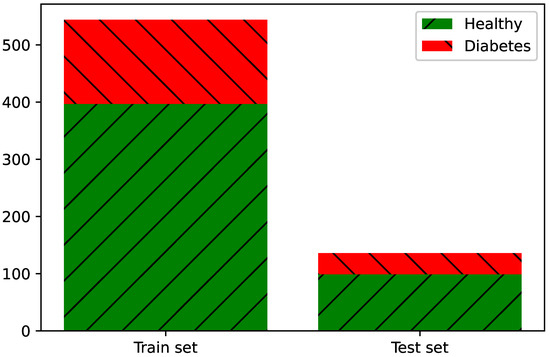 The prepared dataset from the simulation of acetone in the breath was divided into two separate sets—the training set and the test set. In order to simulate the real case, where samples from healthy subjects are overwhelmingly obtained [37,38,70,71], the simulations were conducted with an unbalanced number of samples. Moreover, not every algorithm, i.e., Support Vector Machines, K Nearest Neighbours [72,73,74], works well with an unbalanced dataset; therefore, such experiments are crucial. Due to the unbalanced number of samples belonging to the “healthy” and “diabetes” classes, the data were divided in such a way that the same percentage of samples from each class was included in both the test and training sets. Distribution of samples in the dataset are given in Figure 6.