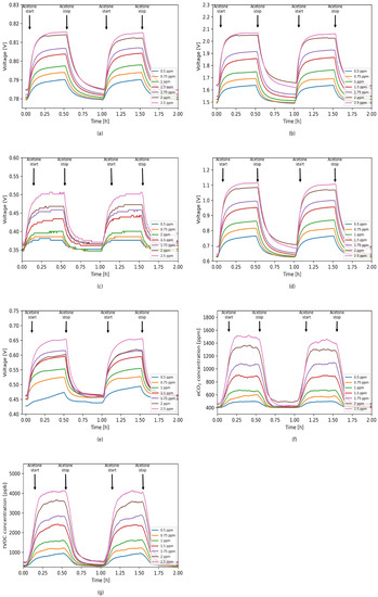 Sensors’ responses to different acetone concentrations in 0% RH. (a) TGS1820; (b) TGS2620; (c) TGS8100; (d) MQ3; (e) MICS5524; (f) SGP30 eCO2; (g) SGP30 tVOC.