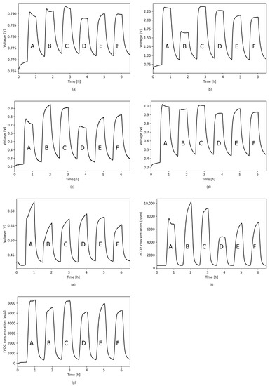 Sensors’ responses to different simulated mixtures in 0% RH. A. 1.5 ppm acetone, 2.5 ppm ethanol, 1 ppm propane; B. 1.5 ppm acetone, 1 ppm ethanol, 2.5 ppm ethylbenzene; C. 1.5 ppm acetone, 1.5 ppm ethanol, 1 ppm ethylbenzene, 1 ppm propane; D. 1.5 ppm acetone, 1.5 ppm ethanol, 1 ppm propane; E. 1.5 ppm acetone, 1.5 ppm ethanol, 0.5 ppm ethylbenzene, 0.5 ppm propane; F. 1.5 ppm acetone, 1 ppm ethanol, 1 ppm ethylbenzene, 0.5 ppm propane; (a) TGS1820; (b) TGS2620; (c) TGS8100; (d) MQ3; (e) MICS5524; (f) SGP30 eCO2; (g) SGP30 tVOC.