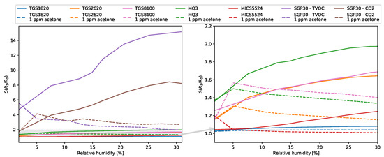 Due to the high humidity of the breath, measurements were made at different simulated humidities. For each of the sensors used, the characteristics of the relative dependence of the sensor’s response to humidity were determined and the dependence of the sensitivity to 1 ppm of acetone on the ambient humidity was also calculated. Results are given in Figure 9.