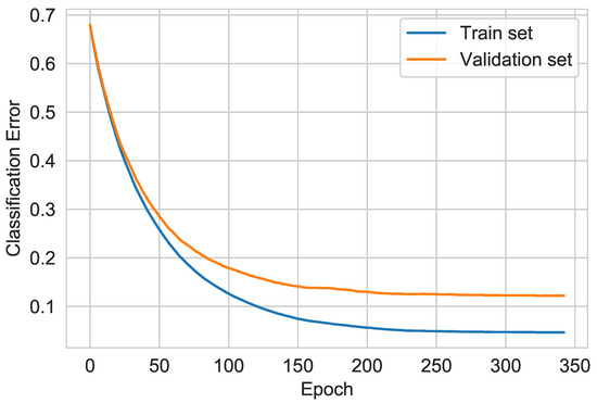 The optimal model hyperparameters were determined using the grid search algorithm. In order to assess whether the model is underfitted or overfitted, validation was used with the use of a separate validation set. Learning curves showing the dependence of the classification error on the number of training epochs are shown in Figure 10.