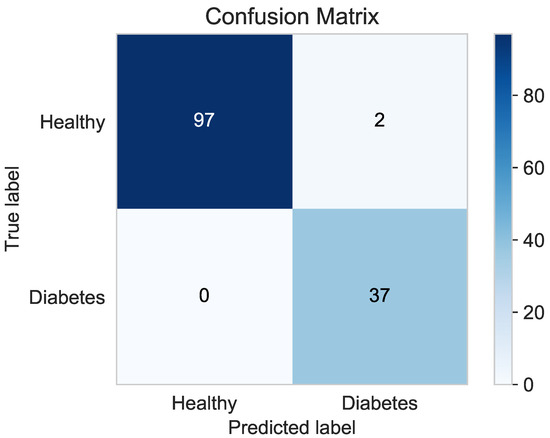 The algorithm’s confusion matrix is shown in Figure 12. It shows that the healthy diabetes samples were classified properly. The confusion matrix allows one to accurately quantify the true positive, true negative, false positive and false negative test samples. Based on these values, the remaining metrics are calculated. In the case of the proposed XGBoost Classifier algorithm, two cases of simulated diabetes patients were incorrectly classified. This is a type I statistical error.
