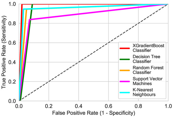 The receiver operating characteristics (ROC) curve shows the dependence between recall and 1-specificity. It is commonly used in machine learning tasks for medical applications. The closer the curve for a given model is to the point (0,1), the better the classifier. The most common problem in designing models for medical data is that the data contain more healthy cases than disease ones [81]. Figure 14 shows the ROC comparison for each of the algorithms used in this research.