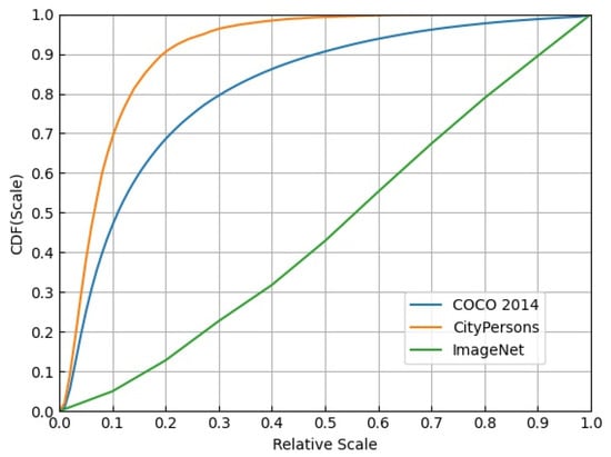 The small pedestrian relative scale (PRS) makes the problem even worse. Figure 2 shows the scale of objects relative to the image in ImageNet [6], COCO [7], and CityPersons datasets. The orange curve representing the CityPersons dataset is the steepest among the three curves, and over 70% of instances occupy less than 1% of the whole image area. Furthermore, the median relative scale of instances in CityPersons is 0.065, which is the smallest compared with that of the ImageNet and COCO (0.556 and 0.110, respectively). Thus, the detector is incapable of effectively extracting RoI (region of interest) features under such an extreme condition.