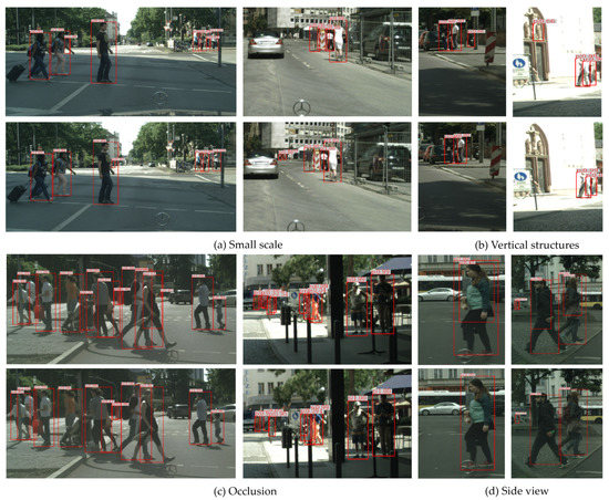 The visualized comparison between the baseline method and our SSNet in different situations is shown in Figure 8. The first and third rows show the results on images with the baseline method, and the second and fourth rows show the results on images with our SSNet. Obviously, SSNet is able to detect the small-scale pedestrians, which are missed in the baseline detector. There are some background errors caused by vertical structures for the baseline method, while SSNet performs well in the vertical context, shown in Figure 8b. In the occlusion scenario, SSNet is more robust than the baseline method. In addition, SSNet achieves more accurate detection and reduces false alarms to some extent for images with side-view persons.
