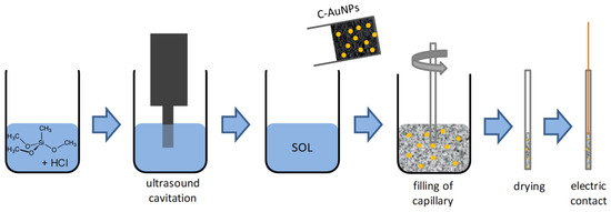 SNG/C-AuNPs electrodes were obtained as reported in [30], starting from methyltrimethoxysilane, natural graphite powder (99.999 % pure, dimension < 74 μm) by Alfa-Aesar (Johnson Matthey GmbH, London, UK) and AuNPs encapsulated with citrate (16.3 nm mean diameter). They were made as schematized in Figure 1, by pouring 0.50 g of the C-AuNPs composite [30] in 0.6 mL of SNG solution; glass capillary tubes with 1.15 mm internal diameter were used as the body of the electrode.