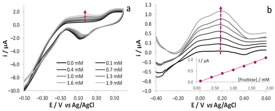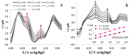 It is well known that CV is not the most proper electrochemical technique for analytical purposes, since it is affected by fairly high background and capacitive current values. A higher signal to noise ratio is generally achieved by recording DPV responses. This is the preferred voltammetric technique in electrochemical sensing. On the other hand, due to the quite peculiar electrochemical mechanism at the basis of glucose and fructose oxidation, which is quite far from being considered a pure diffusive one, the analysis is generally performed by the CV technique. To test the possibility of using this voltammetric technique for such an application, we recorded DPV responses in solutions at different concentration of fructose, once more evidencing a trend of the voltammetric signals with subsequent additions of fructose (Figure 3a). Better evidence of the contribution provided by fructose oxidation was once more obtained after background subtraction (Figure 3b): the intensity of a couple of peaks centred at ca. −0.10 and +0.20 V increases as the concentration of fructose in solution increases.