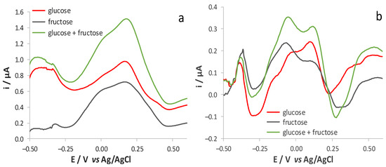 Since complex oenological matrices contain a mixture of glucose and fructose, we tested the possibility to quantify the two analytes when they are present in the same matrix. Both CV (Figure 4a) and DPV (Figure 4b) traces obtained in a solution of either glucose or fructose showed characteristic peaks, whereas the responses recorded in a solution containing an equimolar ratio of the two analytes corresponds to the sum of the contributions of the two oxidation processes. As observed, the differences in the shape of the voltammetric responses of the two analytes are more evident when adopting DPV.