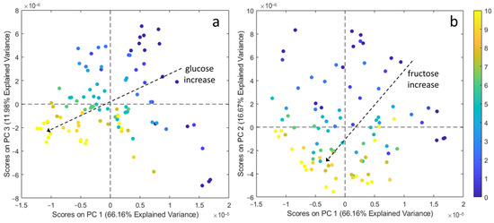 (a) PC1 vs. PC3 score plot with aqueous solution samples coloured according to the glucose content and (b) PC1 vs. PC2 score plot with aqueous solution samples coloured according to the fructose content. The colour bar refers to the sugar concentration which increases from 0 mM (blue) to 10 mM (yellow).