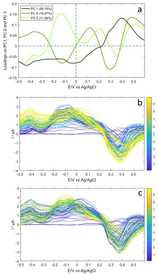 To better describe the portions of the voltammetric signal that mostly contribute to the data structure observable in Figure 5, we reported the loading plots of the first three PCs (Figure 6a) compared to the voltammetric signals which have been coloured according to glucose (Figure 6b) and to fructose (Figure 6c) content.