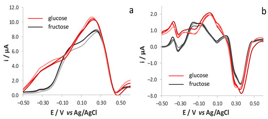 On the other hand, an opposite trend is observed in the potential region between 0 and +0.15 V, where the current values are higher for the solutions with a high glucose content and lower for the solutions with a high fructose content. This portion of the voltammetric signal contains the main oxidation peak ascribable to glucose oxidation, as was evident from Figure 4b.