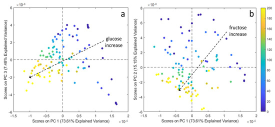 (a) PC1 vs. PC3 score plot of synthetic must samples coloured according to glucose concentration in the sample and (b) PC1 vs. PC2 score plot of synthetic must samples coloured according to fructose concentration in the sample. The colour bar refers to the sugar concentration which increases from 0 g/L (blue) to 200 g/L (yellow).