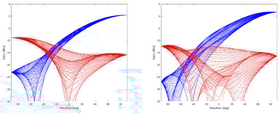 Gain in dBic (RHCP in blue, LHCP in red, different lines represent different azimuth values with a resolution of 5.625 deg) over elevation angle at L1/E1 (left) and L5/E5 (right) of ANYWAVES GNSS All-Bands Antenna (data provided by manufacturer).