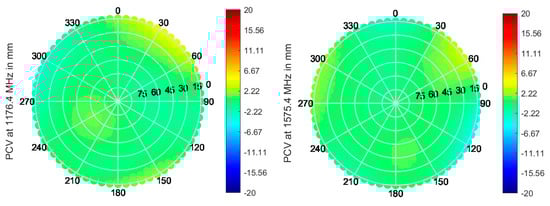 The measured PCV for the frequency bands L1/E1 and L5/E5 are shown in Appendix A. The three choke-ring antennas exhibit a mostly uniform behavior for the PCV over the upper hemisphere, with a maximum range of values of 7.4 mm and 8.2 mm for the Leica AR 25, 8.4 mm and 9.2 mm for the Novatel GNSS 750, and 17.6 mm and 14.5 mm for the Javad RingAnt-DM in the frequency bands L1/E1 and L5/E5, respectively. In general, the PCV has a stable behavior along azimuth and shows variations mostly along the elevation angle, with a “bump” at medium elevations; Javad RingAnt-DM has greater variations among the three.