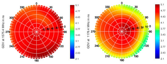 The GD exhibits absolute mean values around 20–21 ns for Leica AR25 and Novatel GNSS-750 and 18.6 ns for Javad RingAnt-DM, in the L1/E1 band, and values around 19 ns for Leica AR25, 18.8 ns for Novatel GNSS-750, and 21.4 ns for Javad RingAnt-DM in the L5/E5 band. All antennas show a mostly stable behavior of the GDV within the upper hemisphere, with a maximum range of 1.3 ns, 0.8 ns, or 1.2 ns, respectively. Some azimuthal variations are to be seen for Leica AR25 and Javad RingAnt-DM at L1/E1, however, within the range of 0.5 to 0.8 ns.