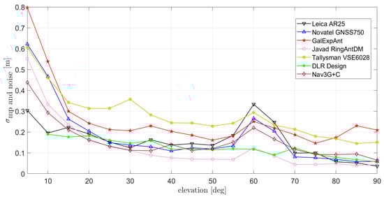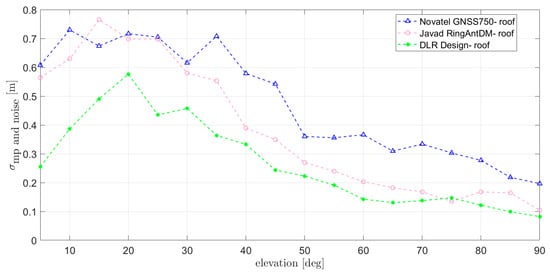 The next subgroup consists of three high-precision GNSS antennas that are smaller in size and lighter in weight than the previously considered antennas, as they are not equipped with a choke ring or a similar structure to reduce multipath. Measurements were performed at DLR and can be compared more in detail in this analysis for Novatel 703-GGG, NavXperience Nav3G+C, and Tallysman Verostar VSE6028, shown in Figure 5.