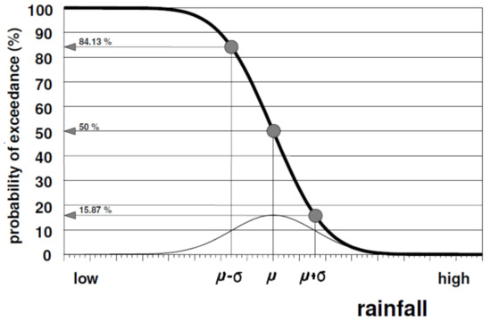 The capability of collecting rain water is connected to the probability of the occurrence of a rainfall depth greater than some given value XP, denoted as the probability of exceedance P, which is expressed either as a fraction (on a scale ranging from 0 to 1) or as a percentage chance (on a scale ranging from 0 to 100%). Figure 1 shows the exceedance probability [1] as a function of the rainfall.