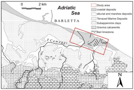 From a geological point of view, the territory surrounding the city of Barletta consists of several units overlapping each other. As Figure 3 clearly shows, moving up from the bottom to the top, these units consist of the limestone of Bari (Cretaceous); the calcarenite of Gravina (upper Pliocene–lower Pleistocene); the Subapennine clays (lower Pleistocene); the Terraced Marine Deposits (middle–upper Pleistocene); and lastly, the alluvial, marshes, and coastal deposits (Holocene) [7].