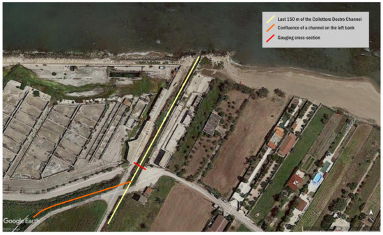 In particular, the Collettore Destro is composed of several drainage channels that merge into a single channel before spilling into the sea. The channel’s gauging cross-section considered in this work is located downstream of the confluence (Figure 4).