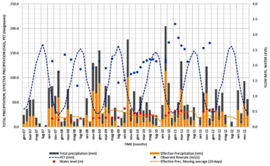 The effective precipitation and the potential evapotranspiration (PET) were assessed based on [15] and the Hargreaves formula, respectively. As reported above, the average flow rate from 2007 to 2012 was about 2.0 m3/s, with a maximum flow rate of about 3.9 m3/s in January 2011 and a minimum of 1.3 m3/s in June 2008. The estimated PET was around 1000 mm/year, as confirmed by the measured values reported in the regional meteorological and climatic statistics published by the Ministry of Agriculture (https://www.politicheagricole.it/, accessed on 18 June 2021).
