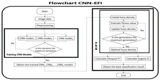 To maximize the efficiency of the convolutional neural network (CNN) model, it is important to include other neural architectures and techniques, namely the evolutionary fuzzy integral (EFI) [21], as shown in the flowchart of Figure 8. An image pre-processing step is required before applying the CNN model, which takes into account the data used as the input of the proposed model and connected to the previous step, called background. In this way, the retrieved image allows to create and to complete the CNN model.