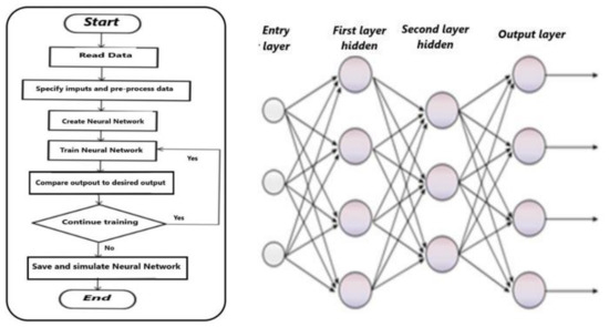 Conversely, with its logic of circulating data only in one direction, i.e., from the input layers to the output layers, the multi-layer perceptron (MLP) is a neural network that flows information directly [22]. Each layer of neurons is fully connected to the neighboring layers. Within the multilayer backpropagation perceptron, the destination neurons experience an effect that alters their information. It must be noted that the neural network automatically finds the optimal values of the weights associated with each connection between the between the different layers of the network. A good connection between the neurons gives a better resolution according to the flowchart shown in Figure 9.